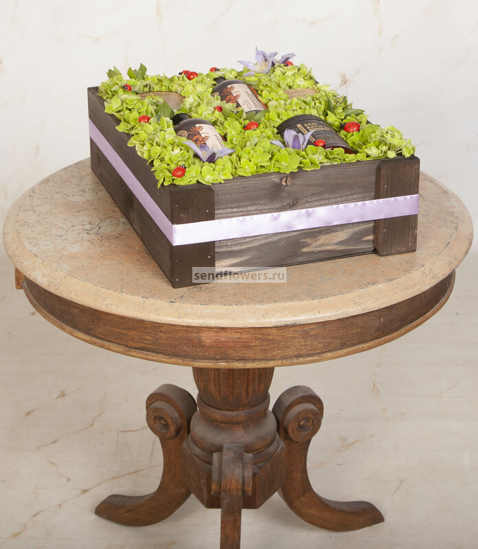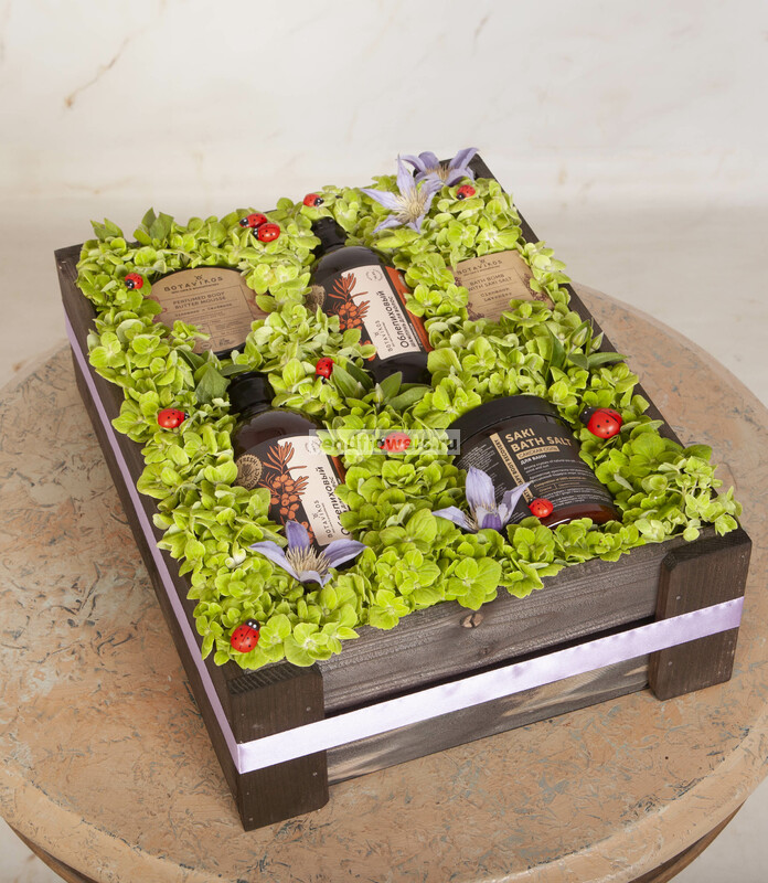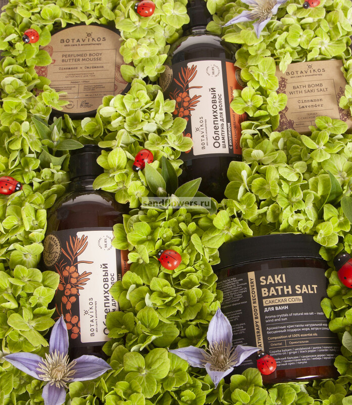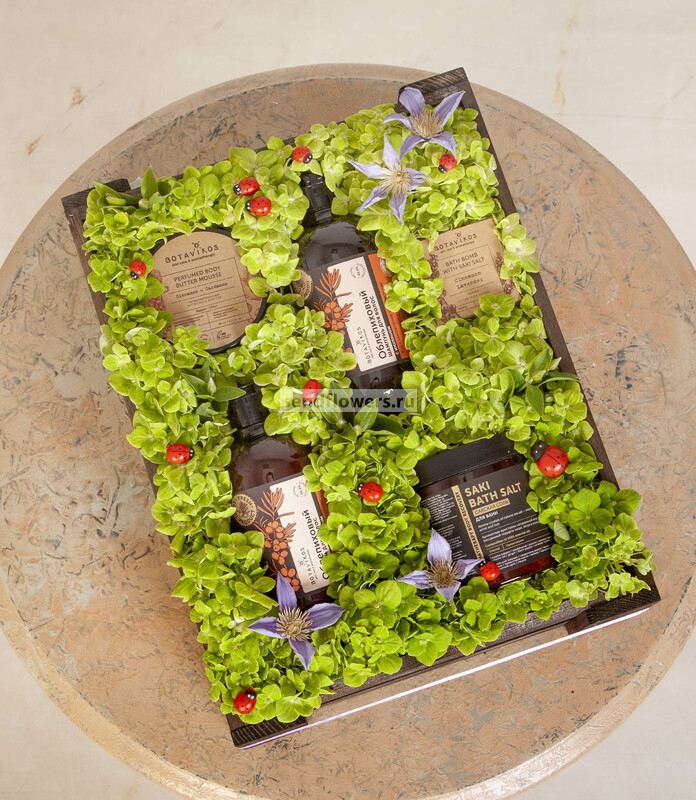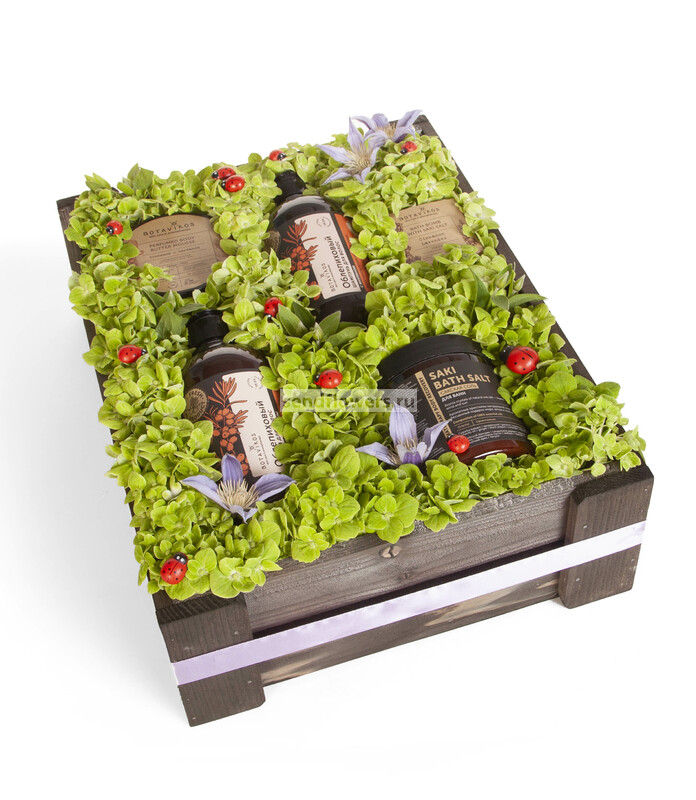 Состав: Оазис кирпич (5), Лента натуральная (5), Клематис (1), Ящик 30х40 (дерево), состаренный (1), Божья коровка декоративная, 1,9см. (10), Гортензия зеленая СО (5), Гейзер для ванны с сакской солью "Корица-лаванда", 120г (1), Парфюмированный баттер-мусс для тела Корица-Кардамон, 150мл (1), Сакская соль с 100% эфирными масламиAromatherapy Recovery, ориентальная, 650 г (1), Облепиховый бальзам с протеинами пшеницы. Восстановление и укрепление, 470 мл (1), Облепиховый шампунь для волос с инулином. Восстановление и укрепление, 470 мл (1)