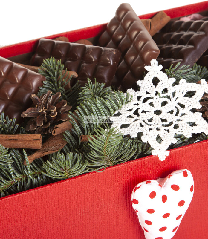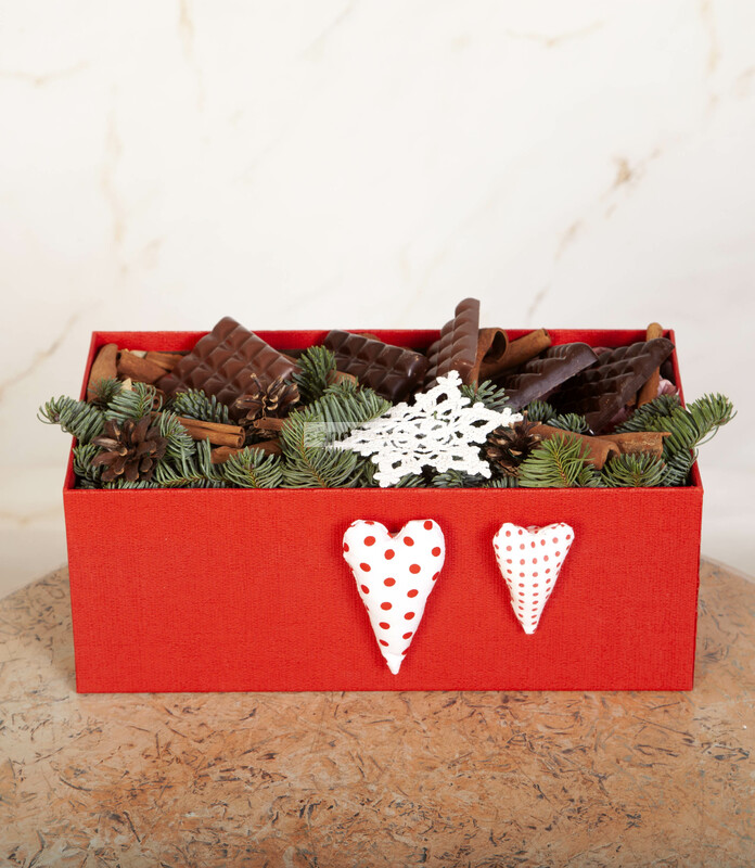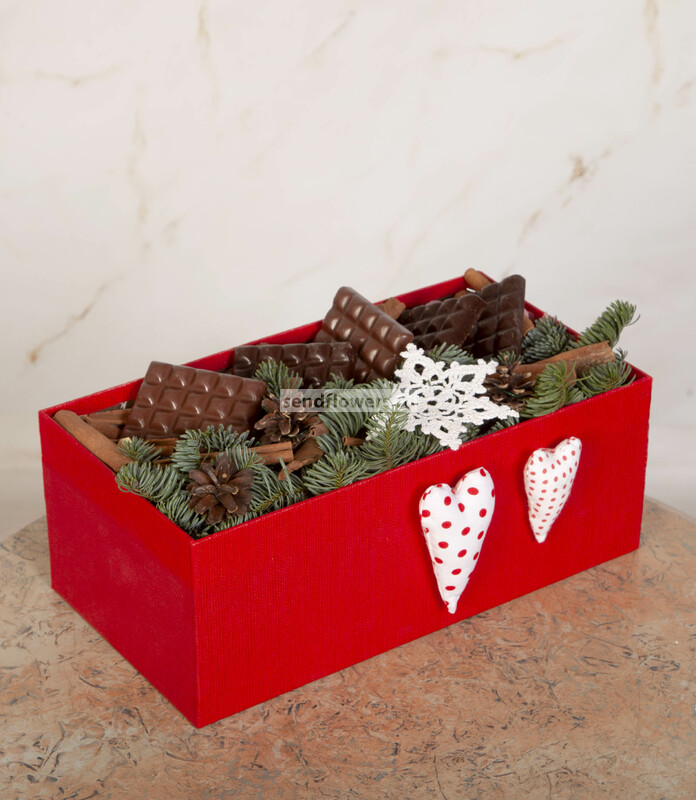Состав: Оазис кирпич (4), Лапник (1), Лента натуральная (5), Шишка натуральная (4), Корица (10), Молочный шоколад CHCO CHOCBAR MILK " Пралине Нуга" 60г. (2), Темный шоколад CHCO CHOCBAR DARK "Лесной орех", 85г (3), wF-73/ 2 Коробка 'Прямоугольник' (1), Игрушка из ткани (2), Вязаные снежинки (1)