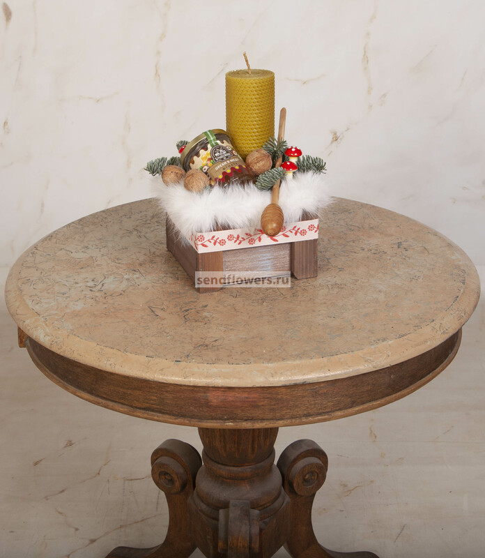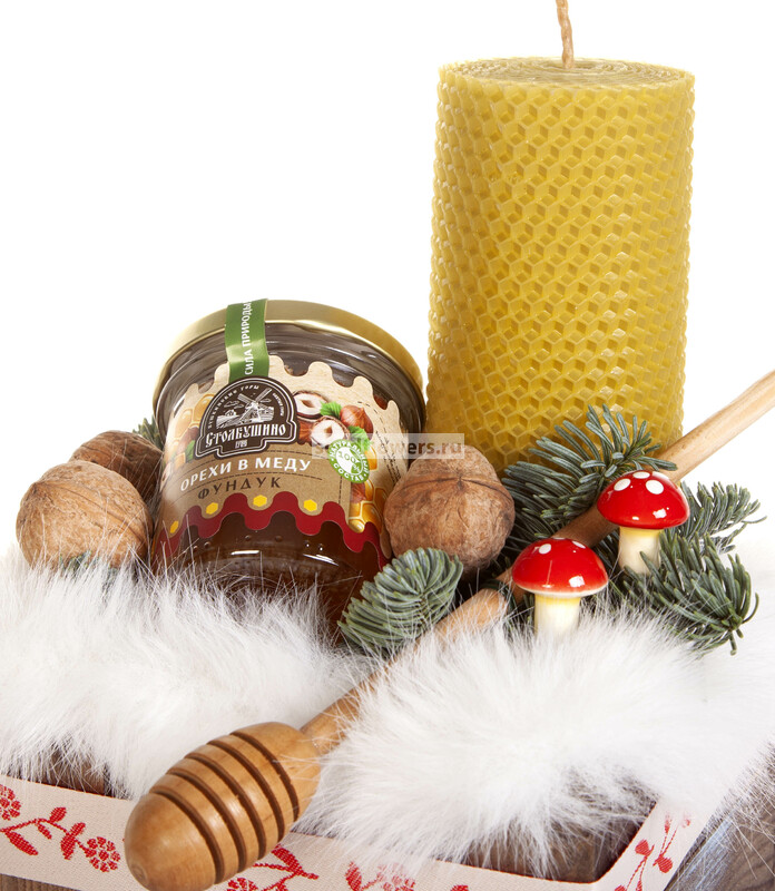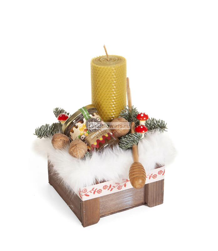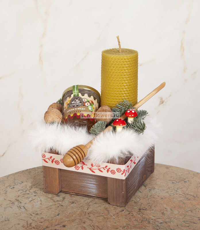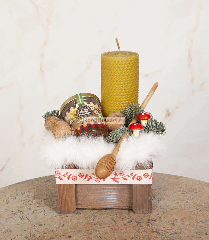 Состав: Оазис кирпич (1), Лапник (1), Лента натуральная (3), Грибы декоративные (3), Ящик 15х15 (дерево), состаренный (1), Грецкий орех (4), Орехи в меду "Столбушинские" Кешью 160 г. стекло (1), Медовая свеча средняя (1), ДР-506 Ложка для меда, деревянная 27х3 (1), Искусственный мех сибирской норки (1)
