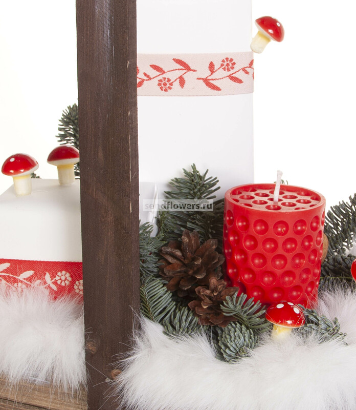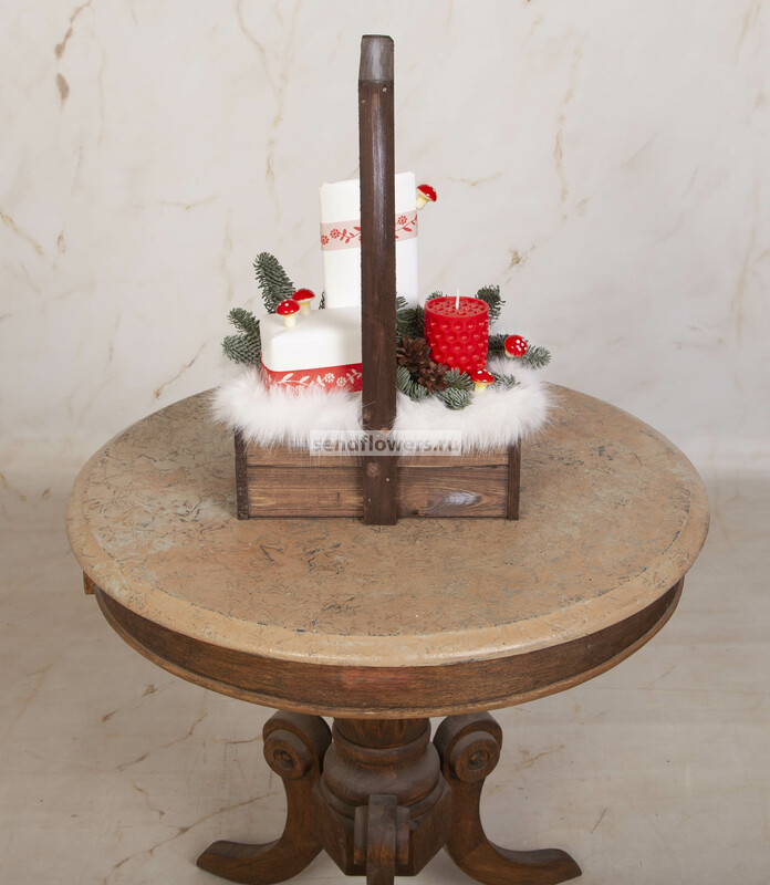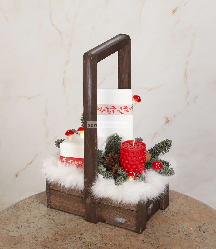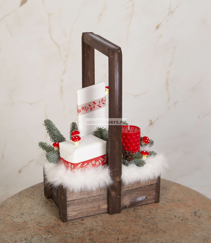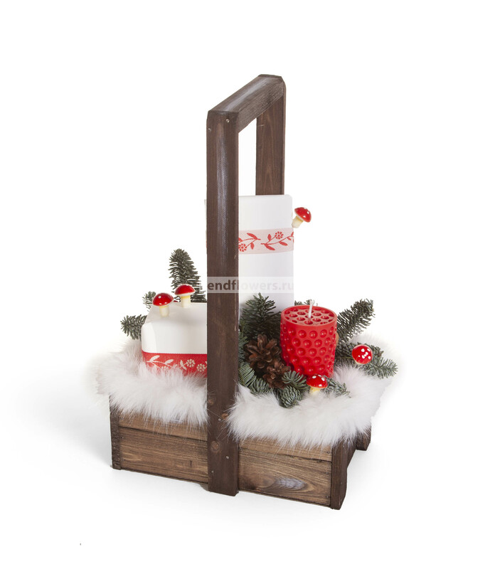Состав: Оазис кирпич (1), Лапник (1), Лента натуральная (10), Грибы декоративные (6), Шишка натуральная (4), Ящик с ручкой 15х25 (дерево), состаренный (1), Пленка матовая (3), ФРАНЦУЗСКИЕ ТРЮФЕЛИ "BARON" со вкусом чили 100гр. (1), Молочный шоколад Belgian с хрустящим печеньем 100гр (1), Декоративная свеча красная (ребристая) (1), Искусственный мех сибирской норки (1)