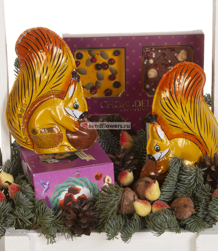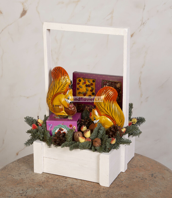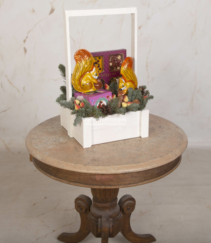 Состав: Оазис кирпич (2), Лапник (2), Лента натуральная (5), Шишка натуральная (5), Груша декоративная (12), Грецкий орех (3), ФРАНЦУЗСКИЕ ТРЮФЕЛИ "BARON" с дробленым фундуком 150гр (1), Ящик с ручкой 25х25 (дерево), выбеленный (1), Подарочный набор "Палитра вкусов", 140 гр, в коробке (1), Фигурный шоколад "Белочка" (2)