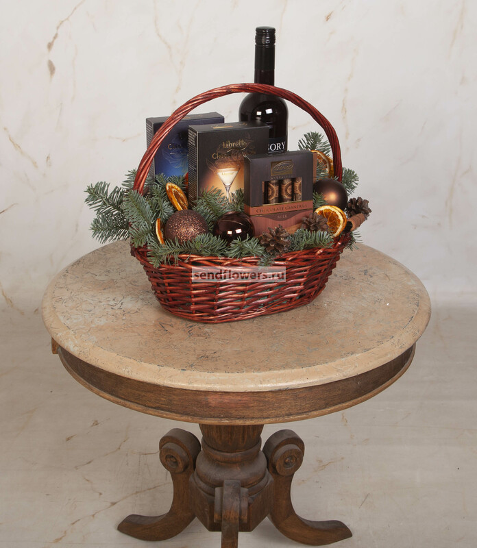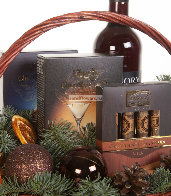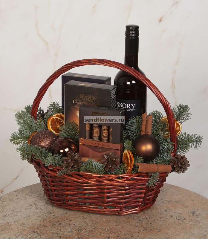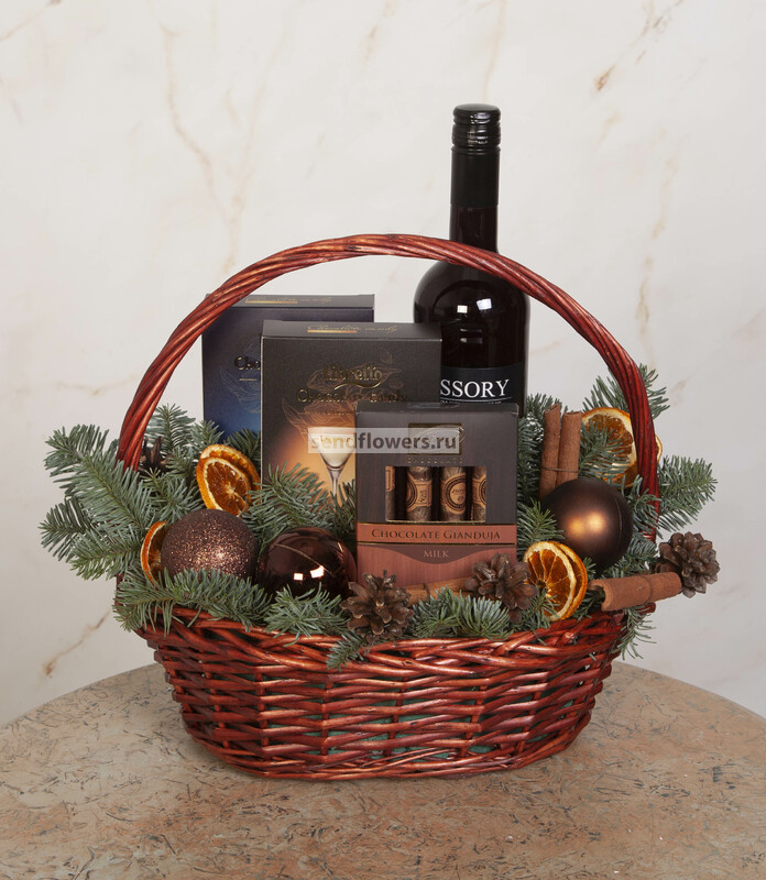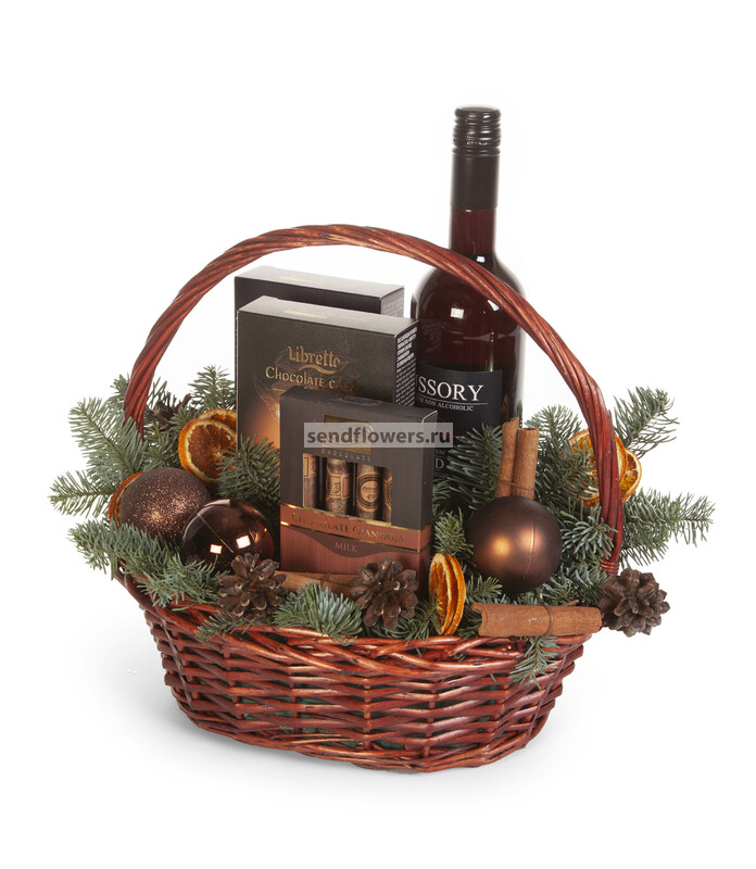 Состав: Оазис кирпич (2), Корзина малая (1), Лапник (1), Лента натуральная (5), Шар новогодний стандартный (пластик) (3), Шишка натуральная (5), Корица (4), Сухофрукты (10), Шоколад BIND "СИГАРА" с пралине (4шт*25г) 100г (1), Вино безалкогольное красное, 0,75 л (1), Конфеты LIBRETTO в темном шоколаде с Коньячной начинкой 144г (1), Конфеты LIBRETTO в темном шоколаде со Сливочным ликером 144г (1)