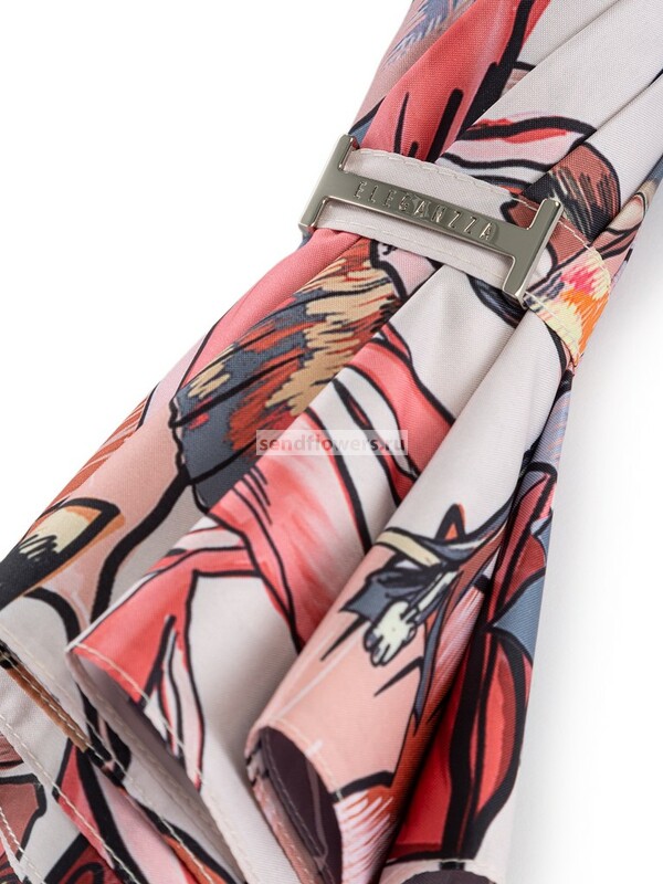 Женский зонт-трость, полуавтомат торговой марки ELEGANZZA. Материал купола: 100% полиэстер, эпонж. Модель с двойным куполом. Материал каркаса: сталь + фибергласс. Материал ручки: пластик. Длина изделия - 86 см. Диаметр купола - 101 см.
