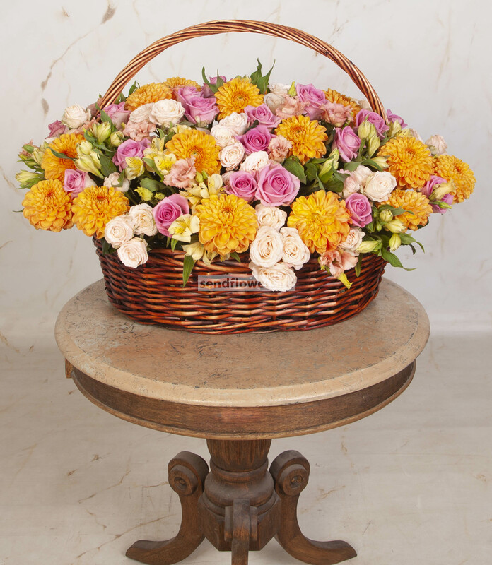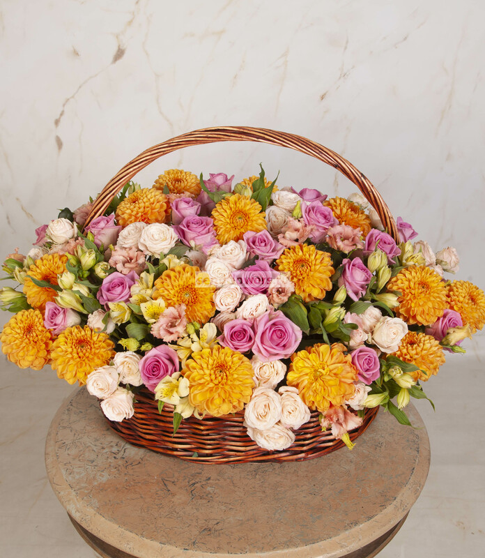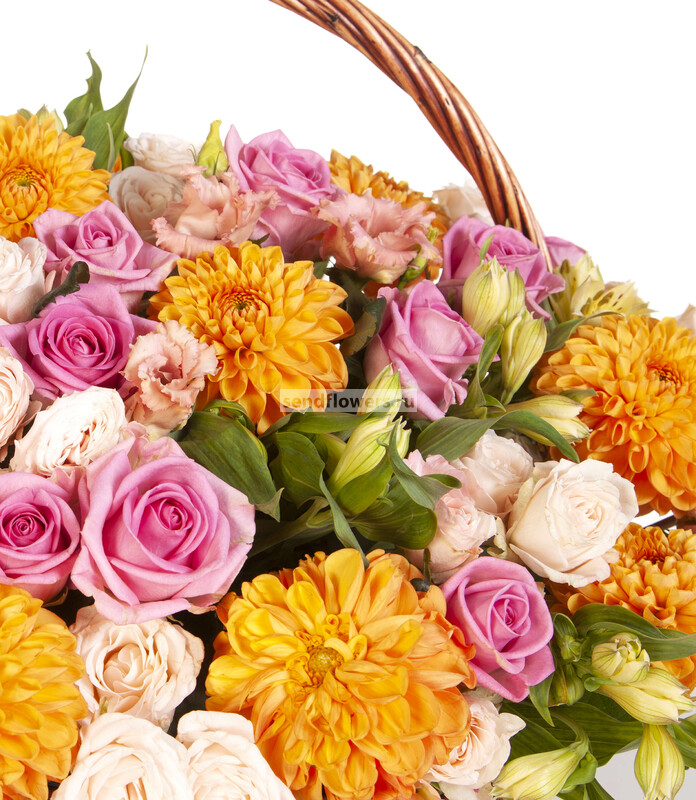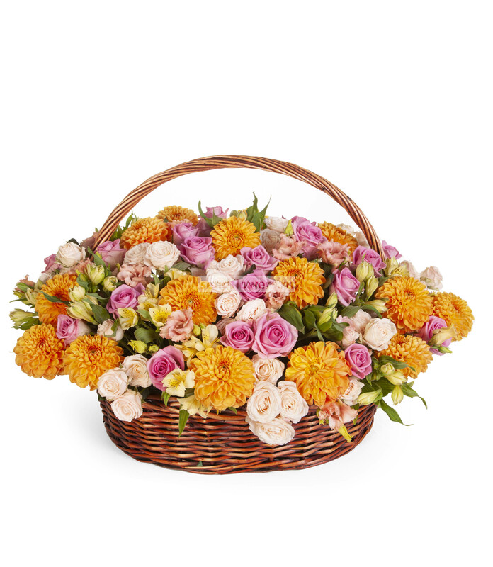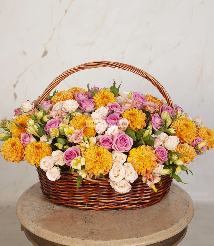 Состав: Корзина средняя (1), Салал (10), Оазис кирпич (6), Альстромерия желтая (10), Роза розовая (20), Роза Bombastic (5), Эустома кремовая (5), Хризантема одноголовая Rossano Orange (10)
