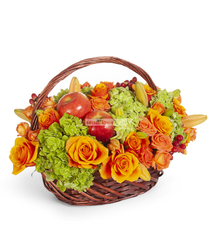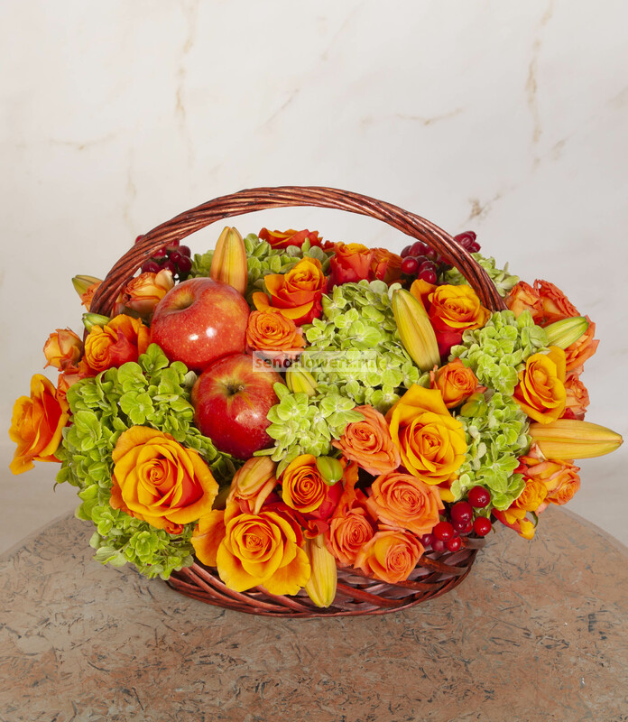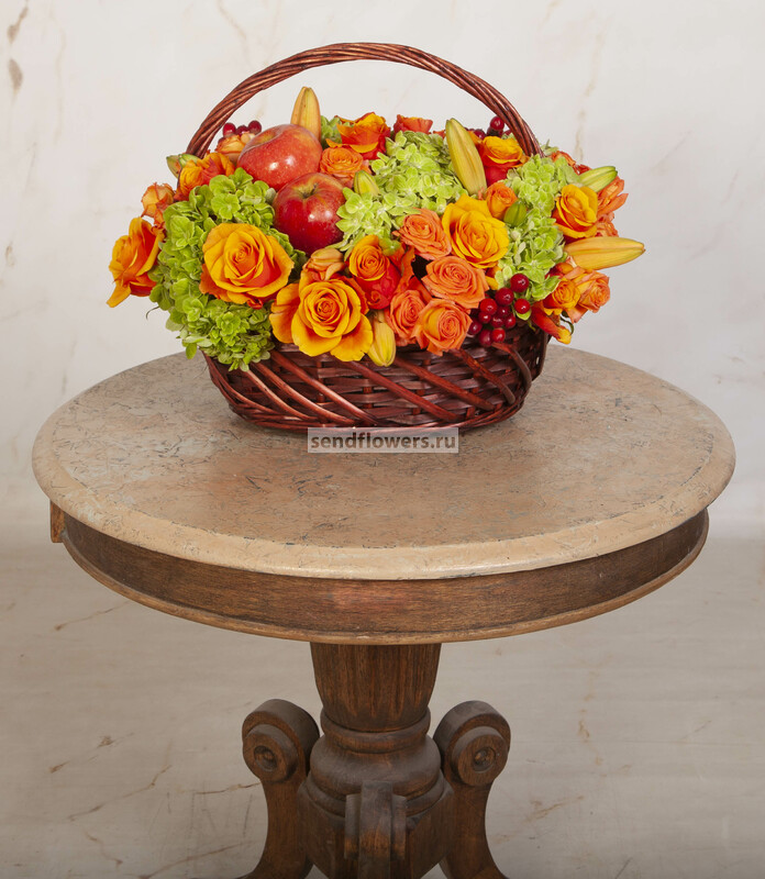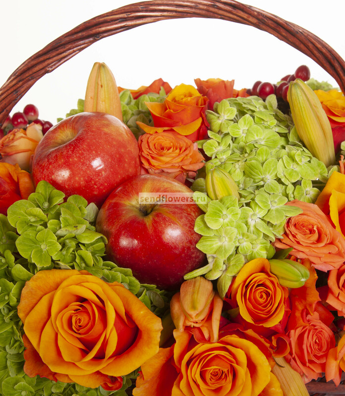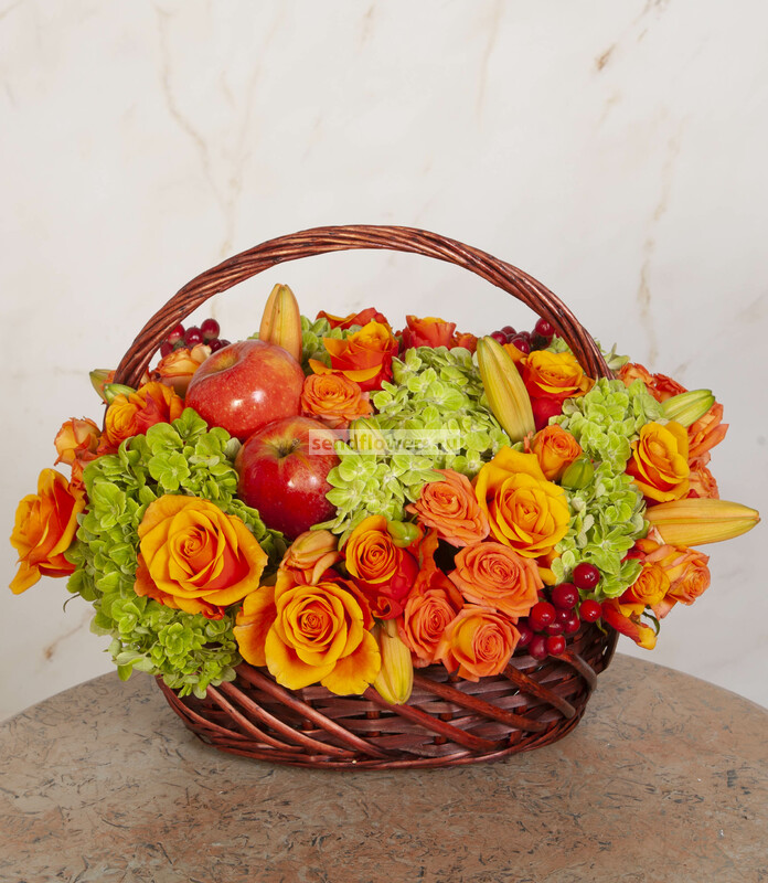 Состав: Корзина средняя (1), Роза кустовая оранжевая (10), Оазис кирпич (5), Яблоки (4), Роза Espana (25), Лилия азиатская оранжевая (5), Гортензия зеленая СО (6)