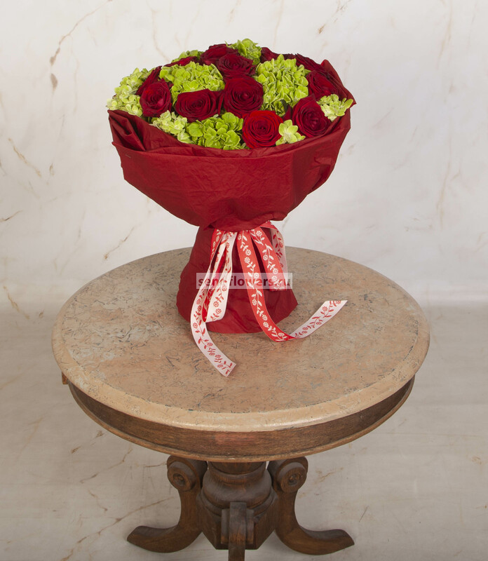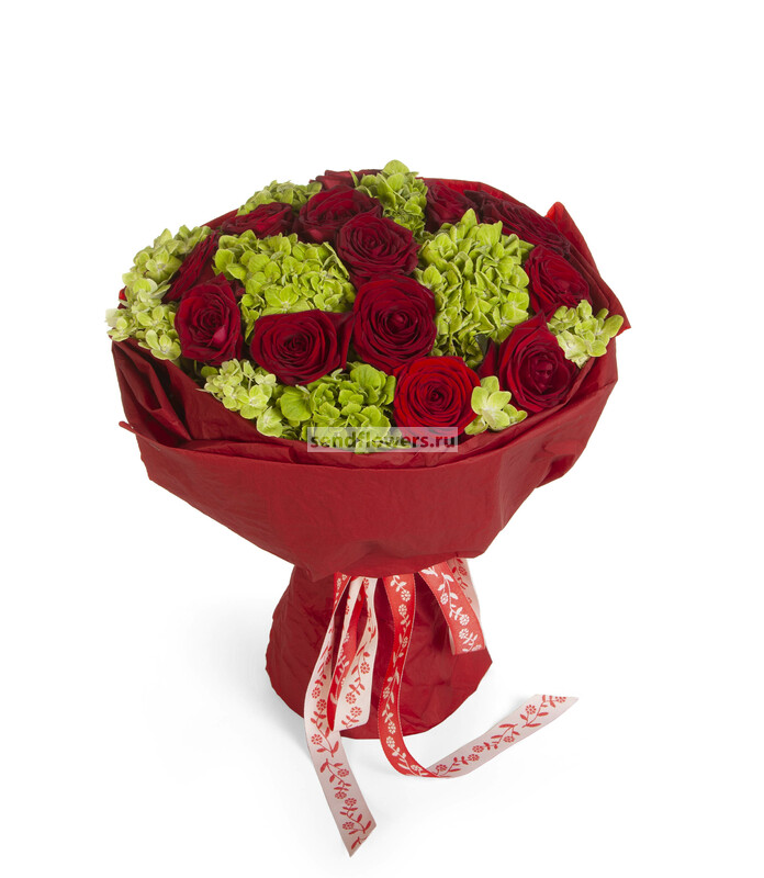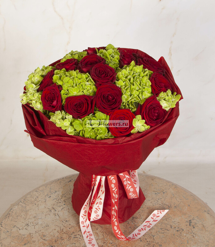 Состав: Лента натуральная (5), Роза Гран При (15), Гортензия зеленая СО (5), Бумага жатая влагостойкая (4)