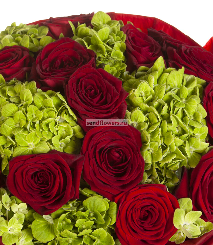Состав: Лента натуральная (6), Роза Гран При (19), Гортензия зеленая СО (7), Бумага жатая влагостойкая (5)