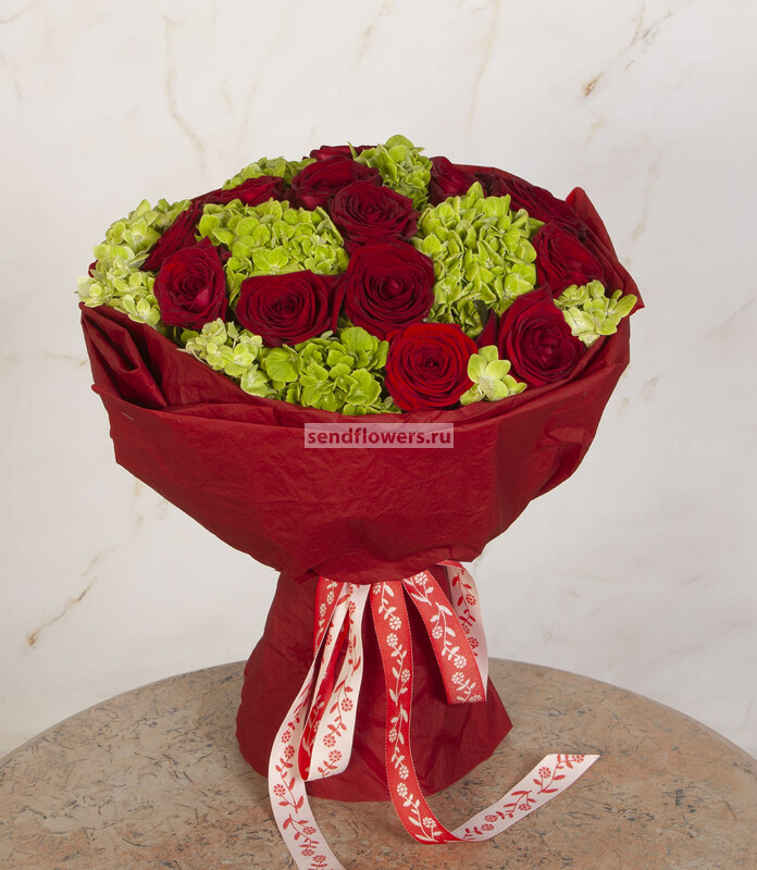 Состав: Лента натуральная (4), Роза Гран При (11), Гортензия зеленая СО (3), Бумага жатая влагостойкая (3)