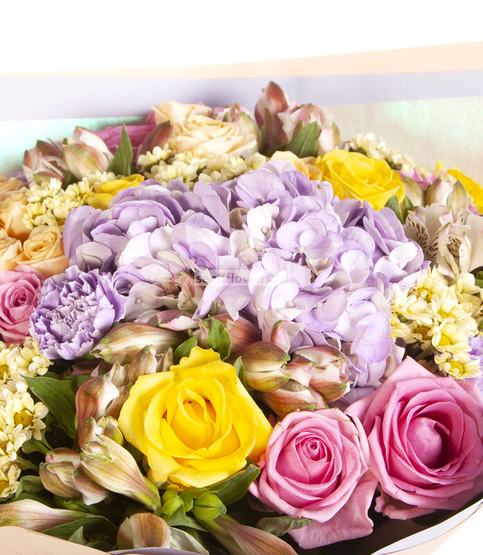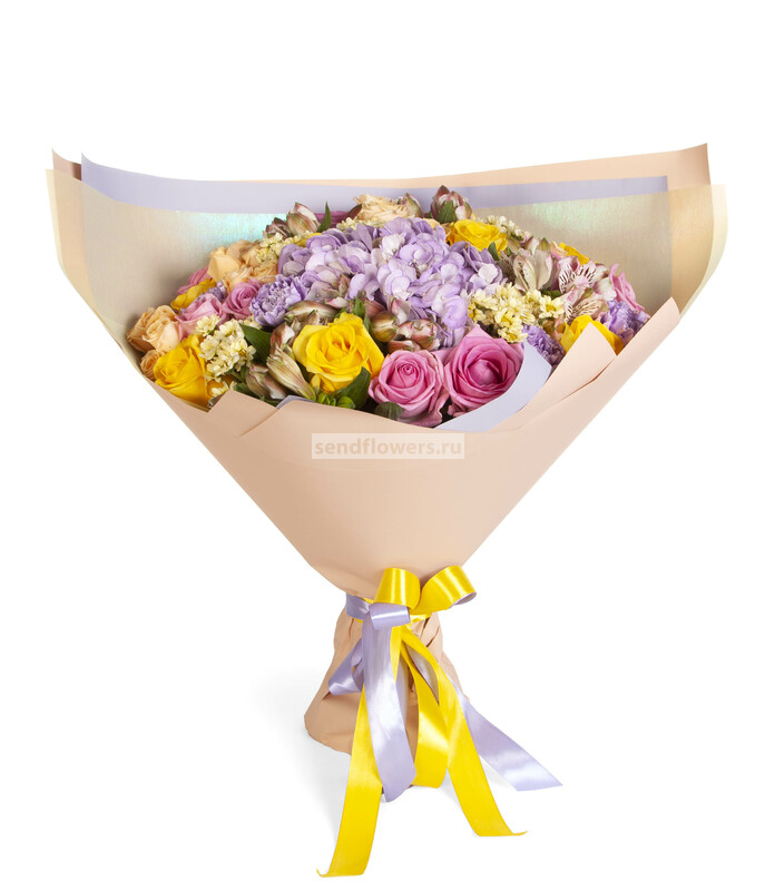Состав: Роза желтая (10), Лента натуральная (6), Гвоздика лиловая (7), Фисташка (7), Альстромерия розовая (7), Роза кустовая розовая (7), Роза розовая (12), Хризантема Сантини кремовая (7), Пленка матовая (5), Гортензия лиловая СО (2)
