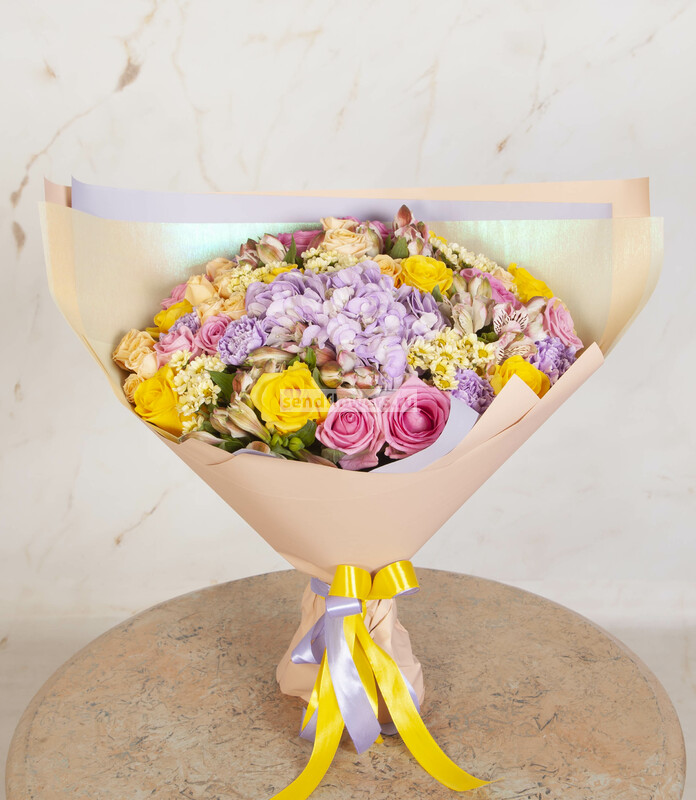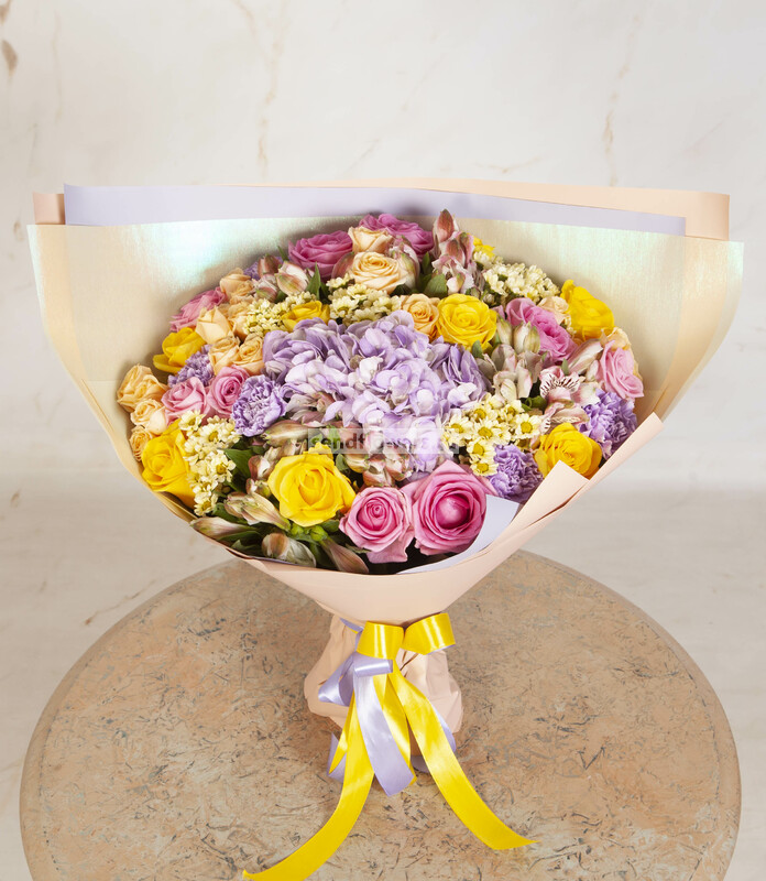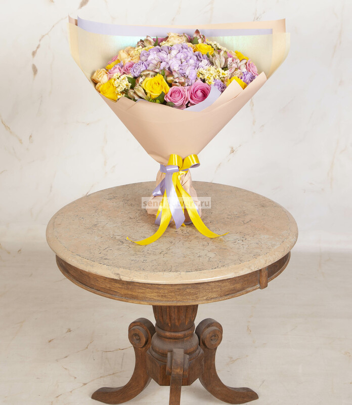 Состав: Роза желтая (8), Лента натуральная (5), Гвоздика лиловая (5), Фисташка (5), Альстромерия розовая (5), Роза кустовая розовая (5), Роза розовая (10), Хризантема Сантини кремовая (5), Пленка матовая (4), Гортензия лиловая СО (1)