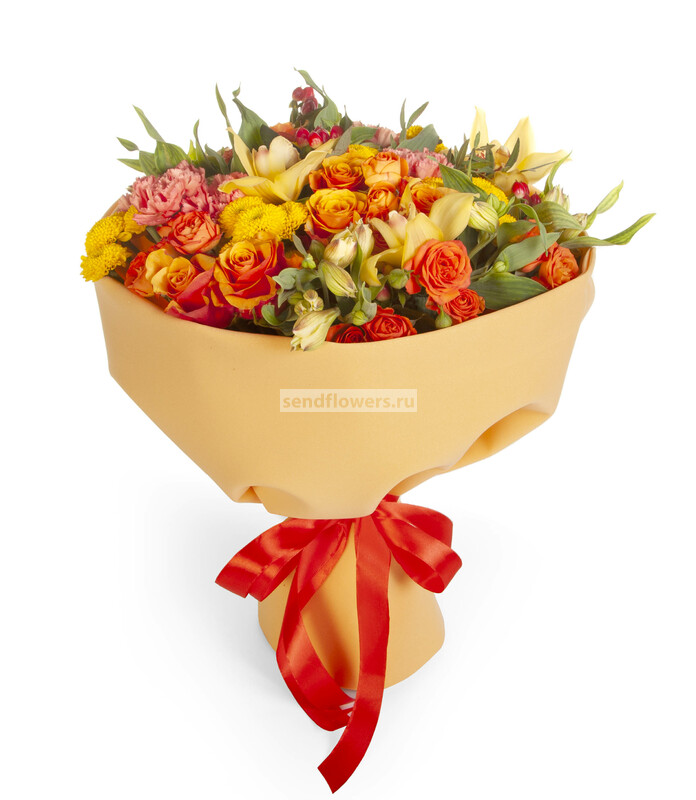 Состав: Гиперикум красный (3), Роза кустовая оранжевая (4), Лента натуральная (4), Роза Espana (9), Фисташка (7), Альстромерия желтая (5), Орхидея Цимбидиум желтый (3), Хризантема Сантини желтая (5), Фоамиран (3), Гвоздика Crazy Horse (5)