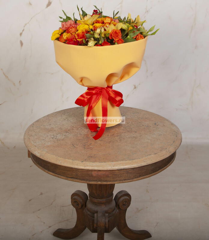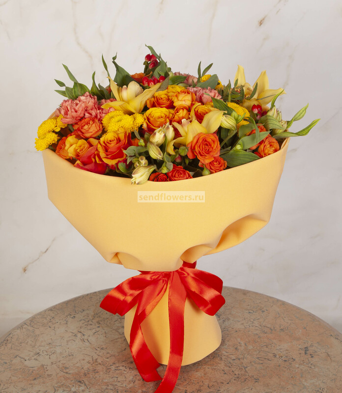 Состав: Гиперикум красный (2), Роза кустовая оранжевая (2), Лента натуральная (3), Роза Espana (7), Фисташка (5), Альстромерия желтая (3), Орхидея Цимбидиум желтый (1), Хризантема Сантини желтая (3), Фоамиран (2), Гвоздика Crazy Horse (3)