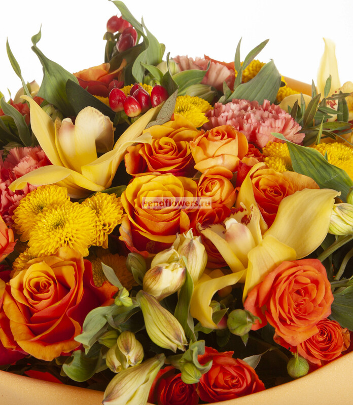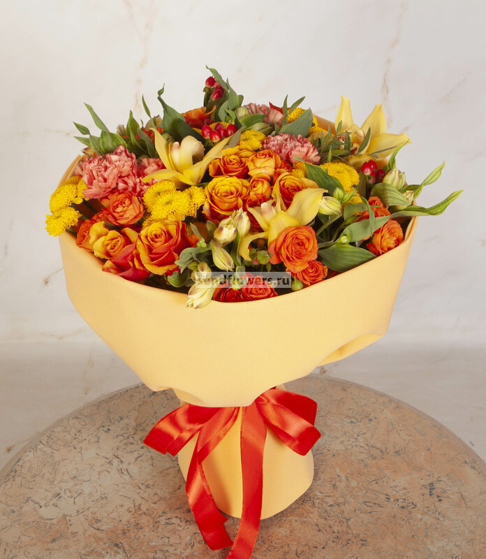 Состав: Гиперикум красный (4), Роза кустовая оранжевая (6), Лента натуральная (5), Роза Espana (11), Фисташка (9), Альстромерия желтая (7), Орхидея Цимбидиум желтый (5), Хризантема Сантини желтая (7), Фоамиран (4), Гвоздика Crazy Horse (7)