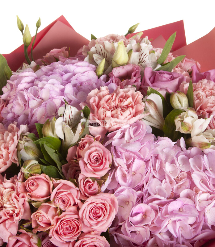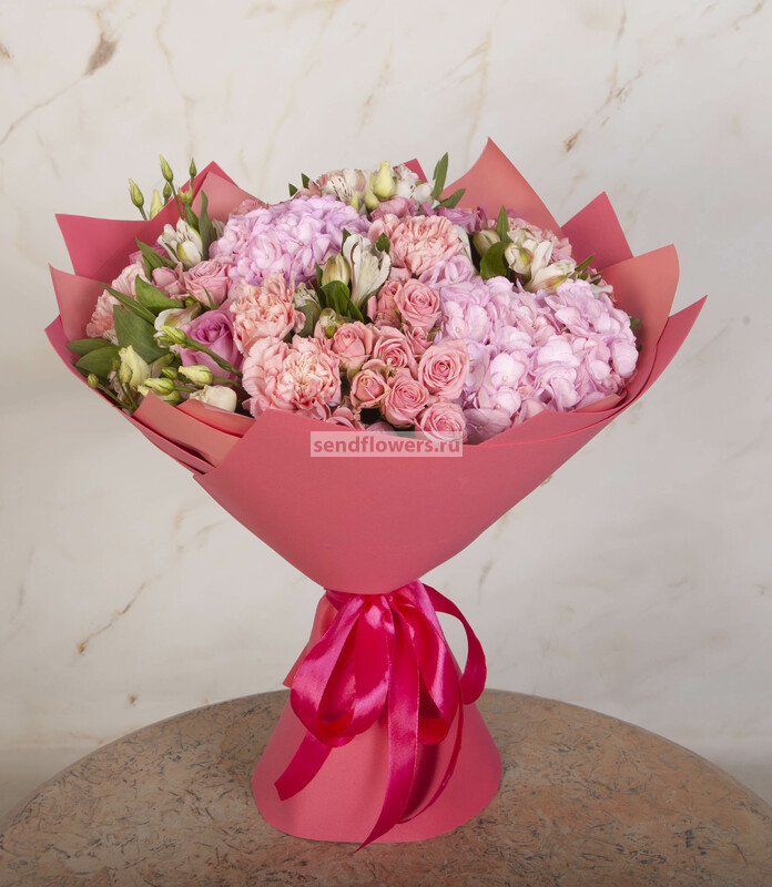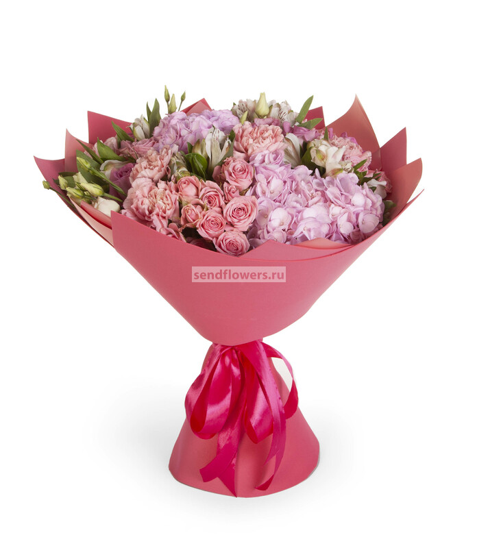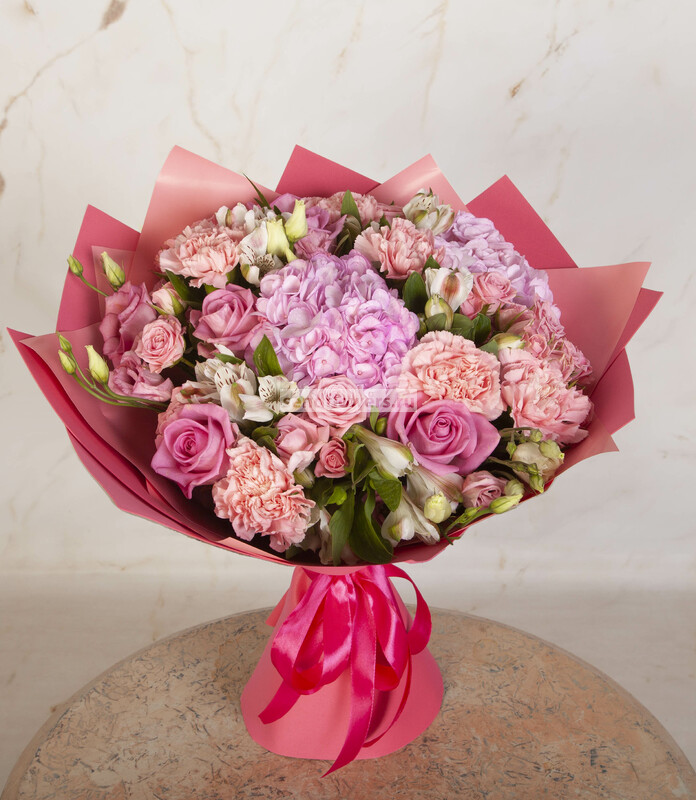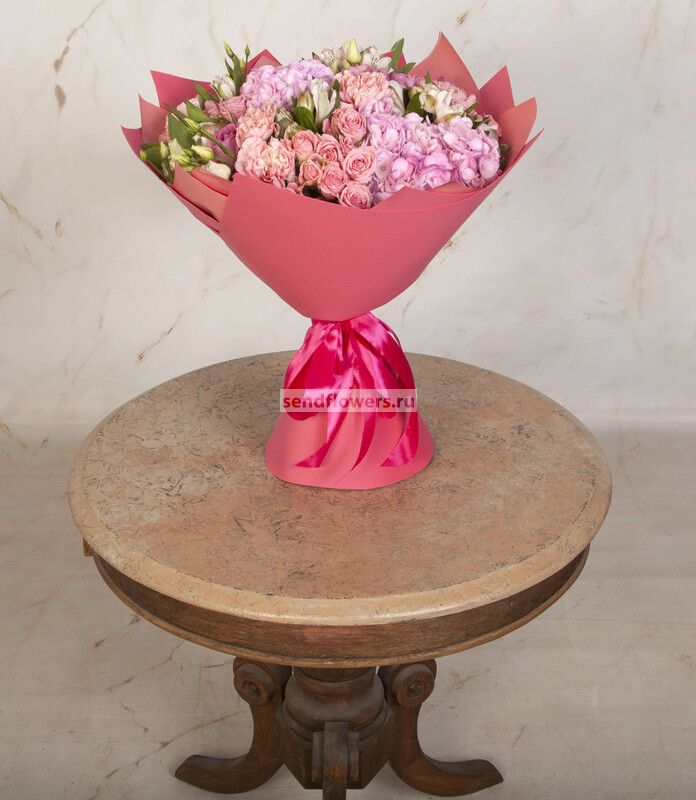 Состав: Лента натуральная (3), Фисташка (3), Альстромерия розовая (3), Роза кустовая розовая (3), Эустома розовая (2), Гвоздика розовая (5), Фоамиран (2), Пленка матовая (1), Гортензия розовая CO (1), Роза розовая (3)