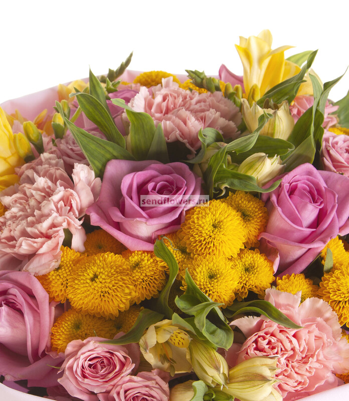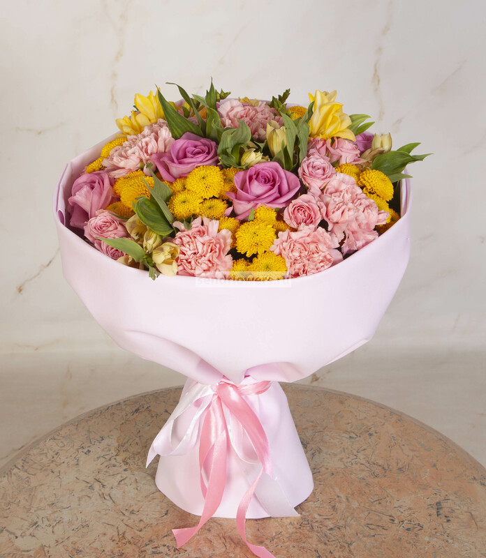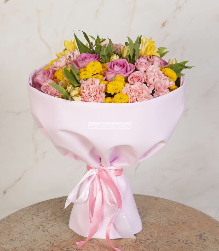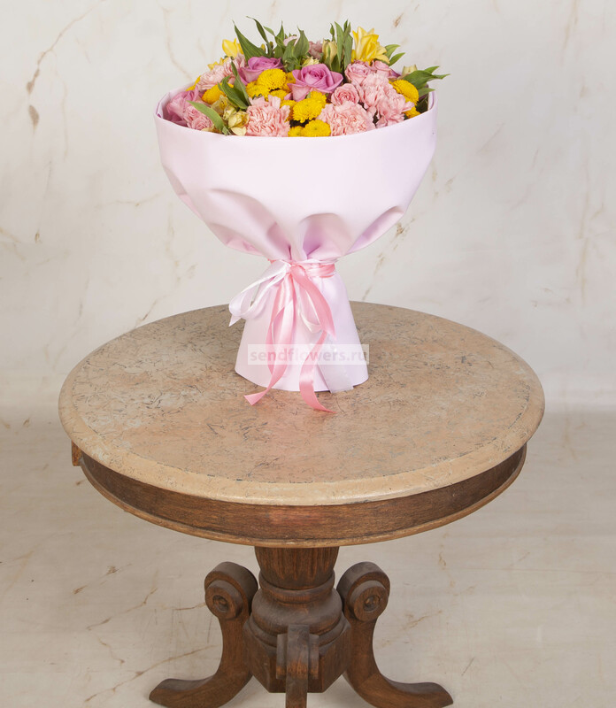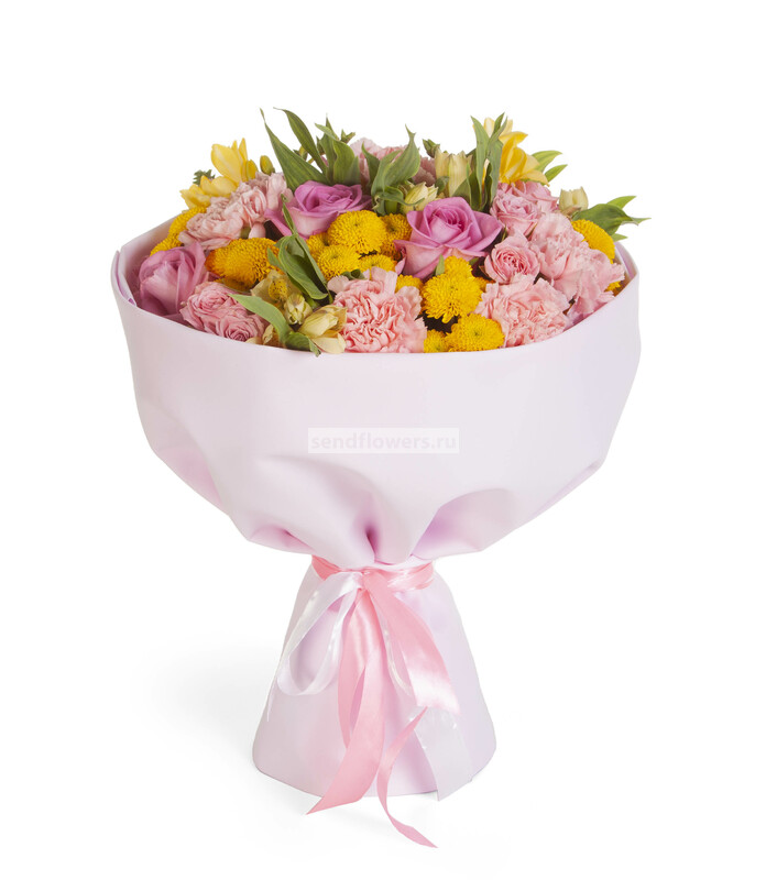 Состав: Лента натуральная (5), Фисташка (9), Альстромерия желтая (6), Роза кустовая розовая (7), Фрезия желтая (7), Роза розовая (7), Гвоздика розовая (9), Хризантема Сантини желтая (9), Фоамиран (4)