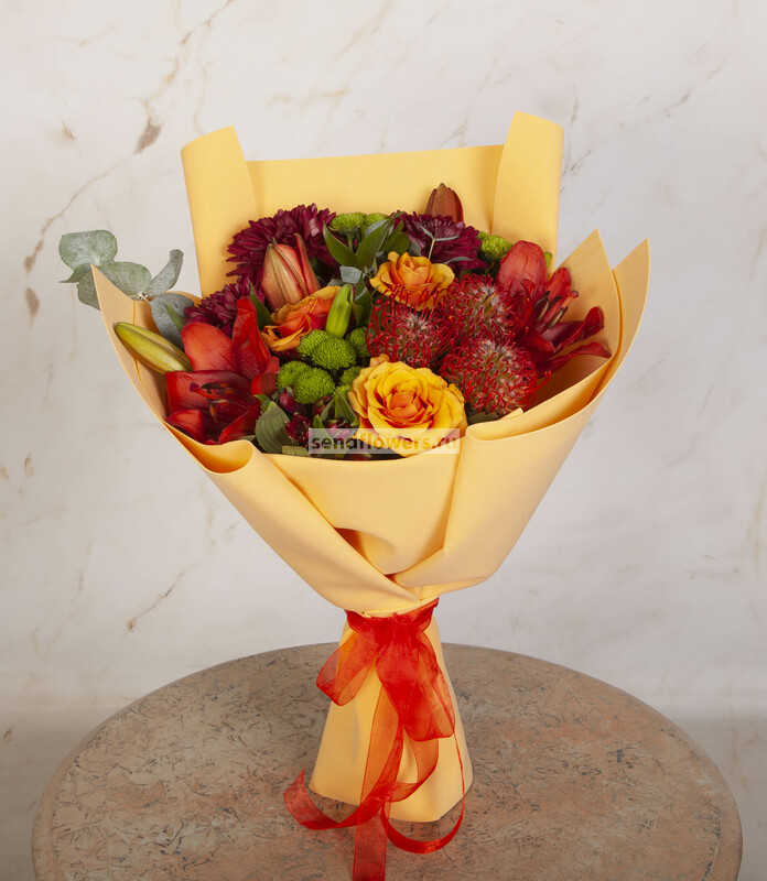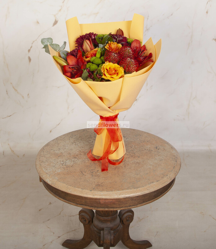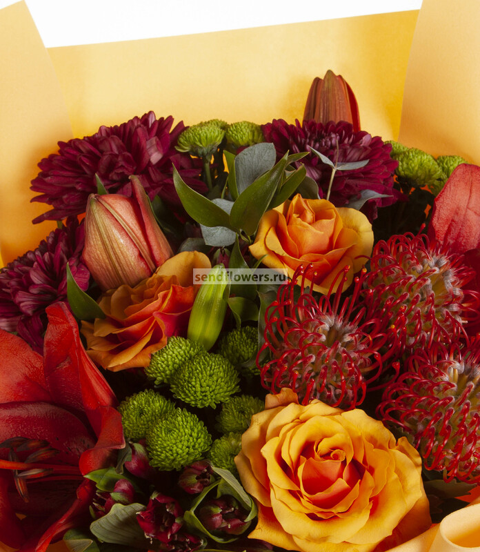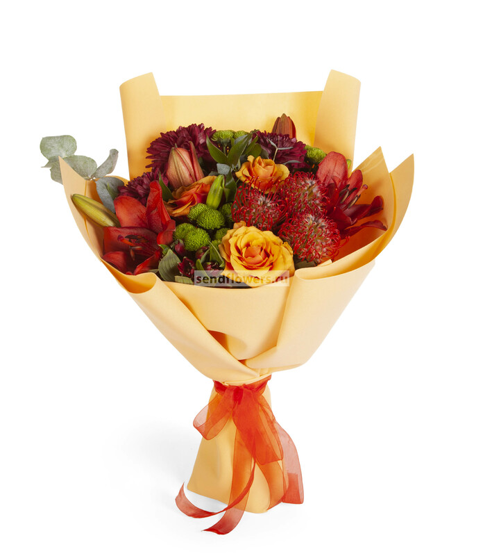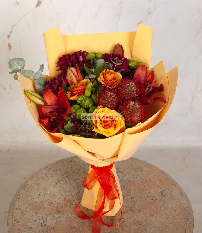Состав: Эвкалипт (2), Нутан красный Tango (3), Лента натуральная (3), Роза Espana (3), Фисташка (5), Альстромерия красная (3), Лилия азиатская красная (2), Хризантема Сантини зеленая (3), Фоамиран (2), Хризантема одноголовая Barca Red (5)