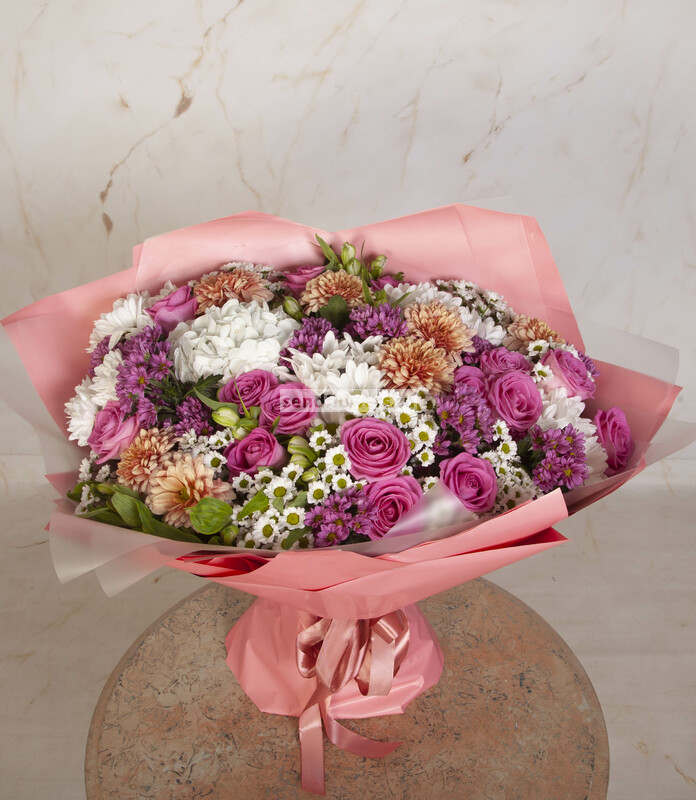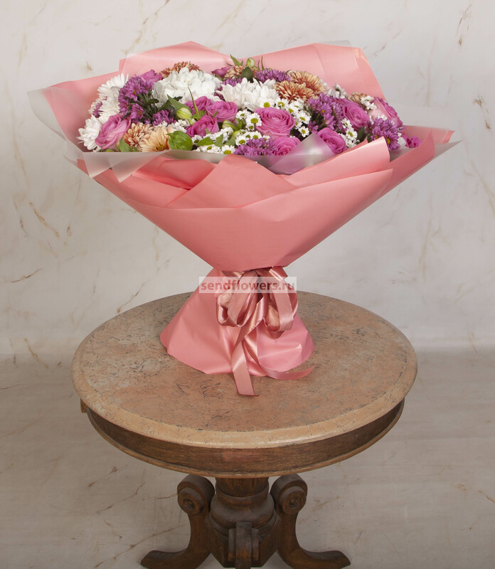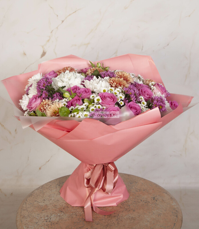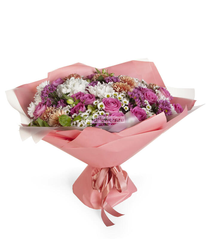Состав: Лента натуральная (4), Альстромерия белая (7), Роза розовая (15), Хризантема Сантини белая (11), Хризантема Сантини лиловая (10), Хризантема кустовая Bacardi (5), Пленка матовая (3), Хризантема одноголовая Pip Salmon (7), Гортензия белая CO (1)