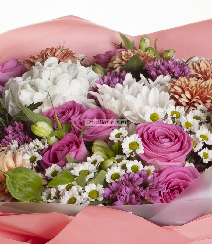Состав: Лента натуральная (5), Альстромерия белая (9), Роза розовая (20), Хризантема Сантини белая (13), Хризантема Сантини лиловая (12), Хризантема кустовая Bacardi (7), Пленка матовая (4), Хризантема одноголовая Pip Salmon (9), Гортензия белая CO (2)