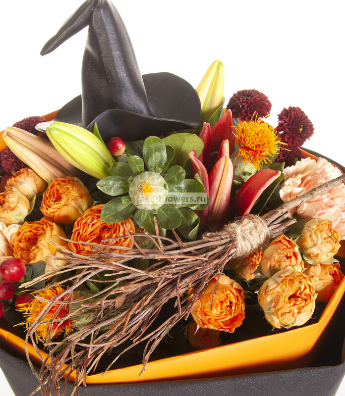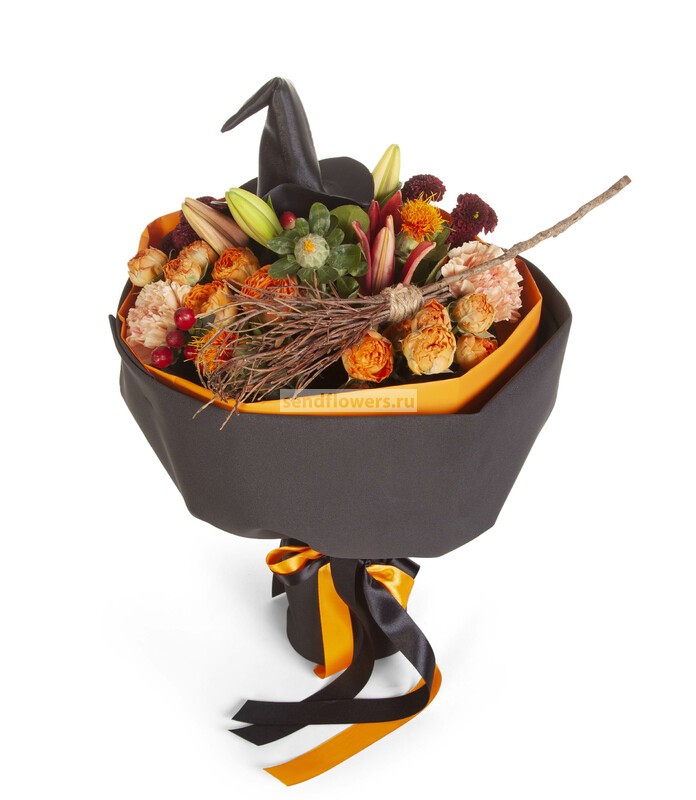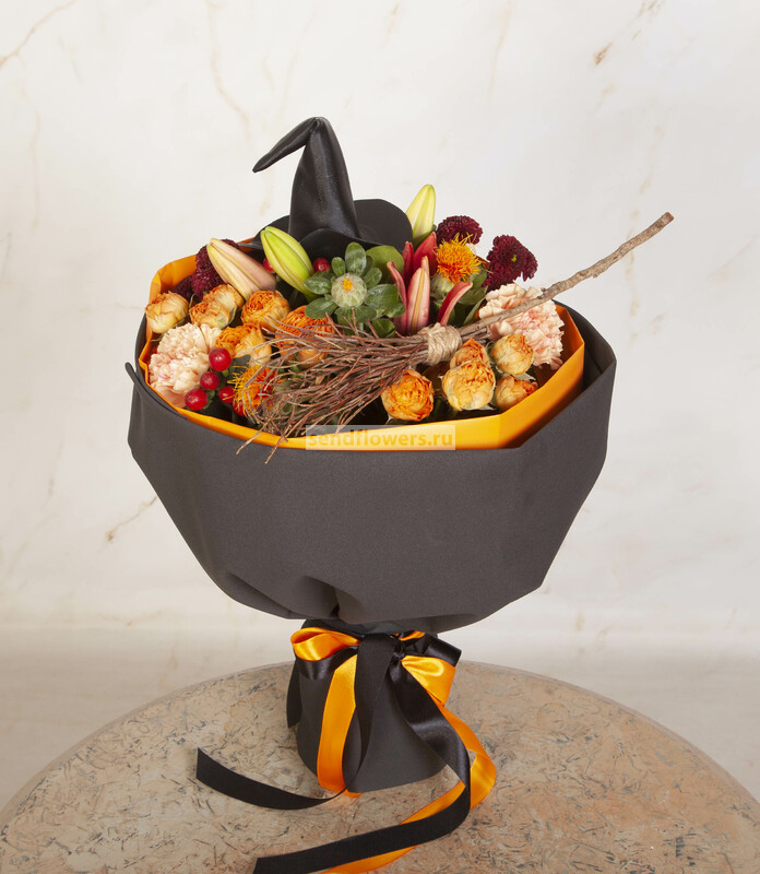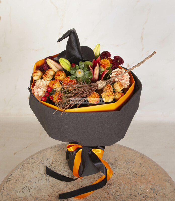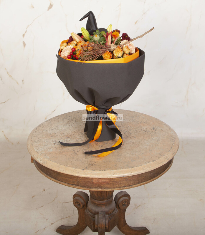 Состав: Гиперикум красный (2), Салал (5), Роза кустовая оранжевая (7), Лента натуральная (5), Шнур декоративный (5), Фисташка (4), Лилия азиатская красная (1), Хризантема Сантини красная (2), Фоамиран (2), Пленка матовая (3), Гвоздика Novia (3), Декоративная шляпа (малая) (1)