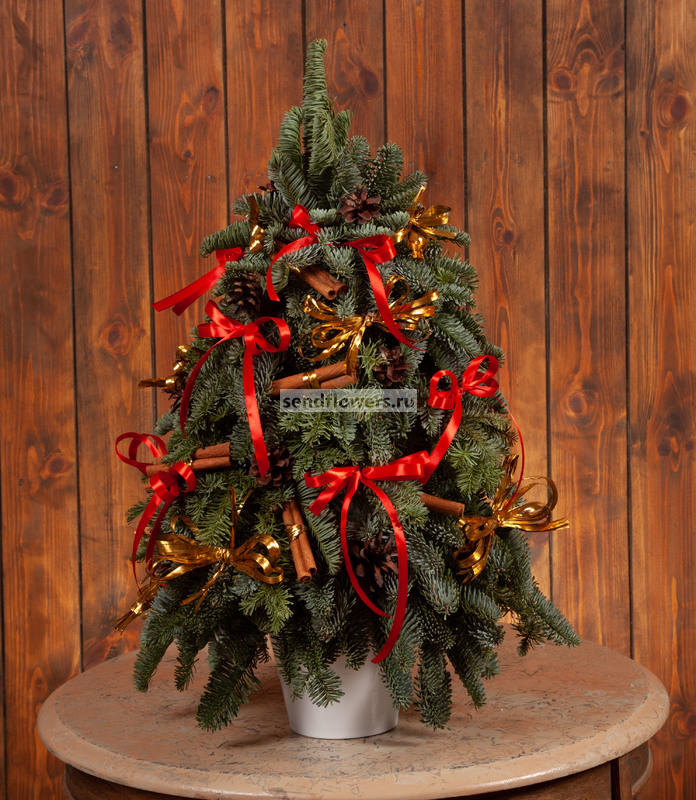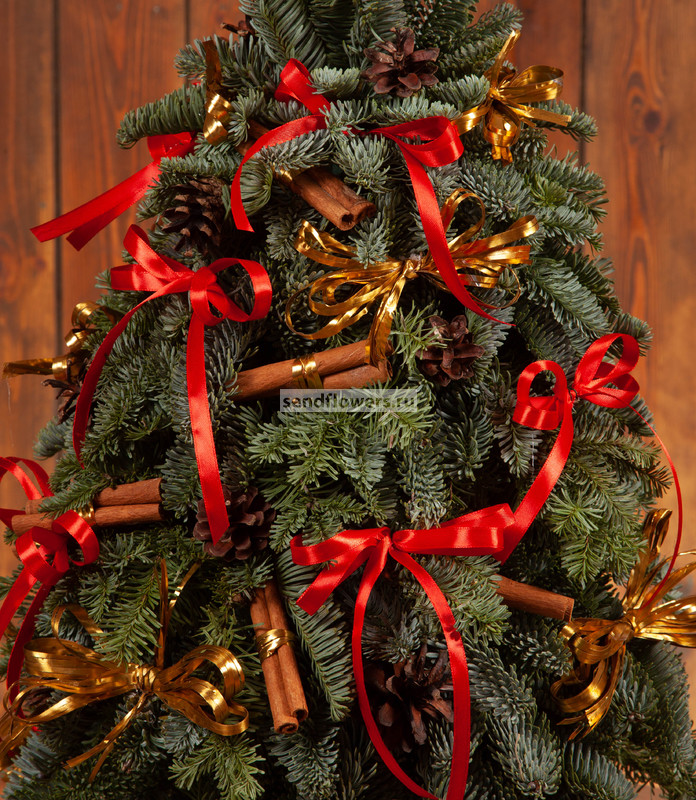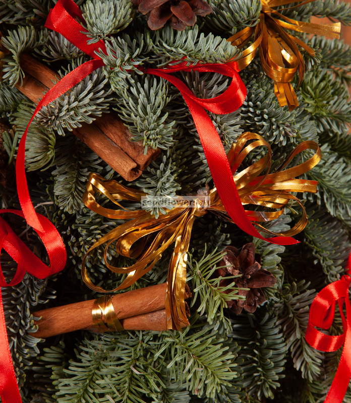 Состав: Оазис кирпич (1), Плошка (1), Лапник (3), Лента натуральная (3), Шишка натуральная (10), Корица (10), Лента раффия (3)