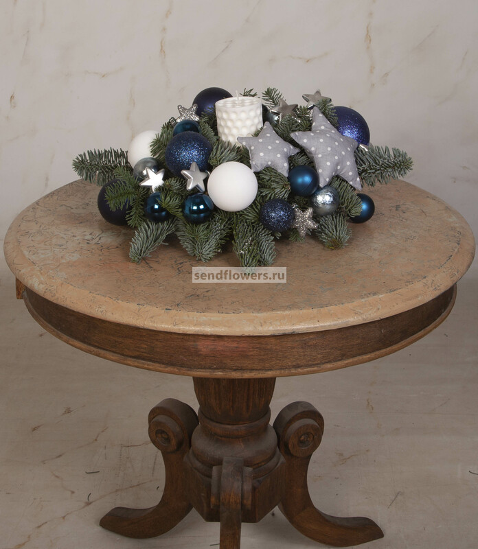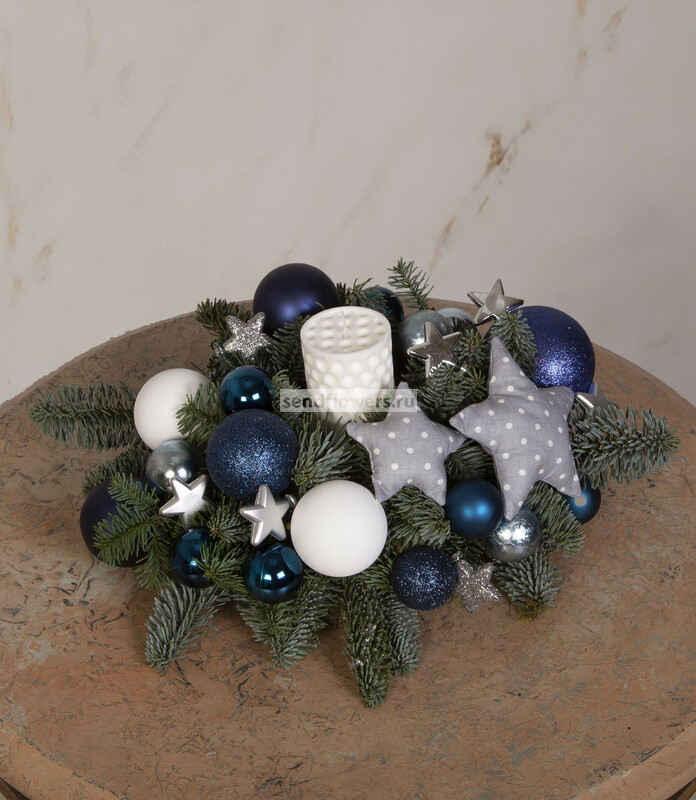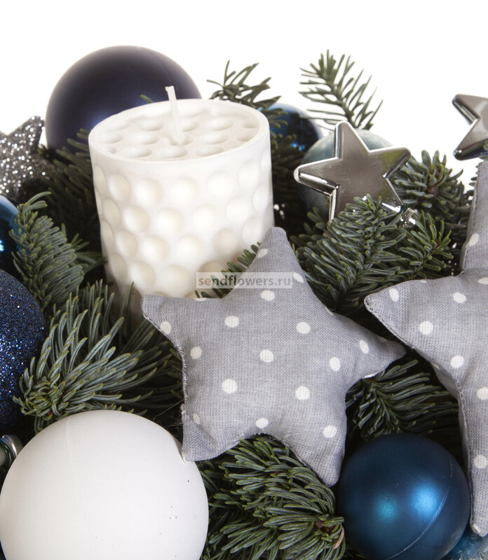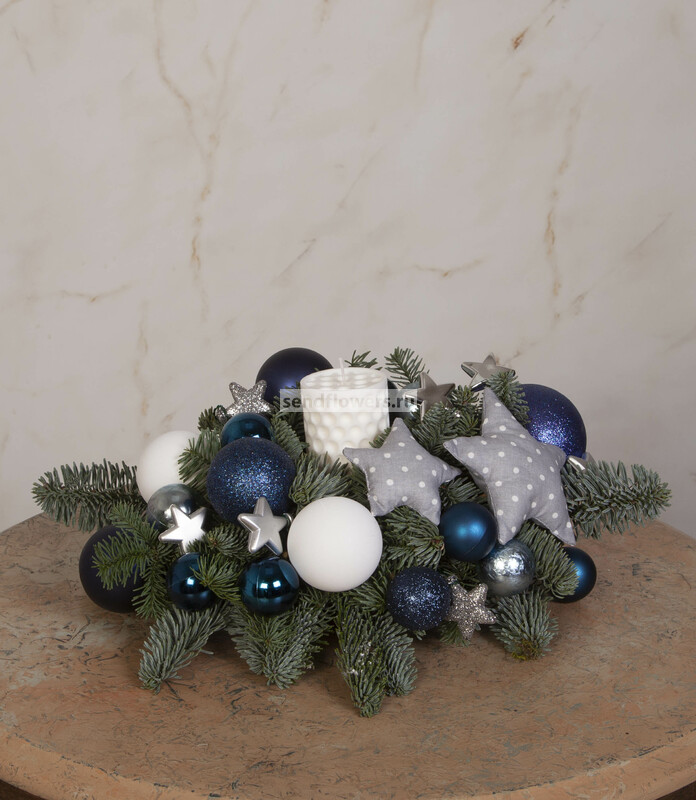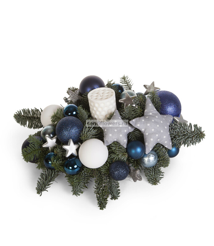 Состав: Оазис кирпич (1), Лапник (2), Лента натуральная (3), Шар новогодний стандартный (пластик) (6), Шарики-мини (пластик) (10), Плошка для кирпича (1), Звезды, ёлочки декор на вставке (блест.) (7), Декоративная свеча белая (ребристая) (1)